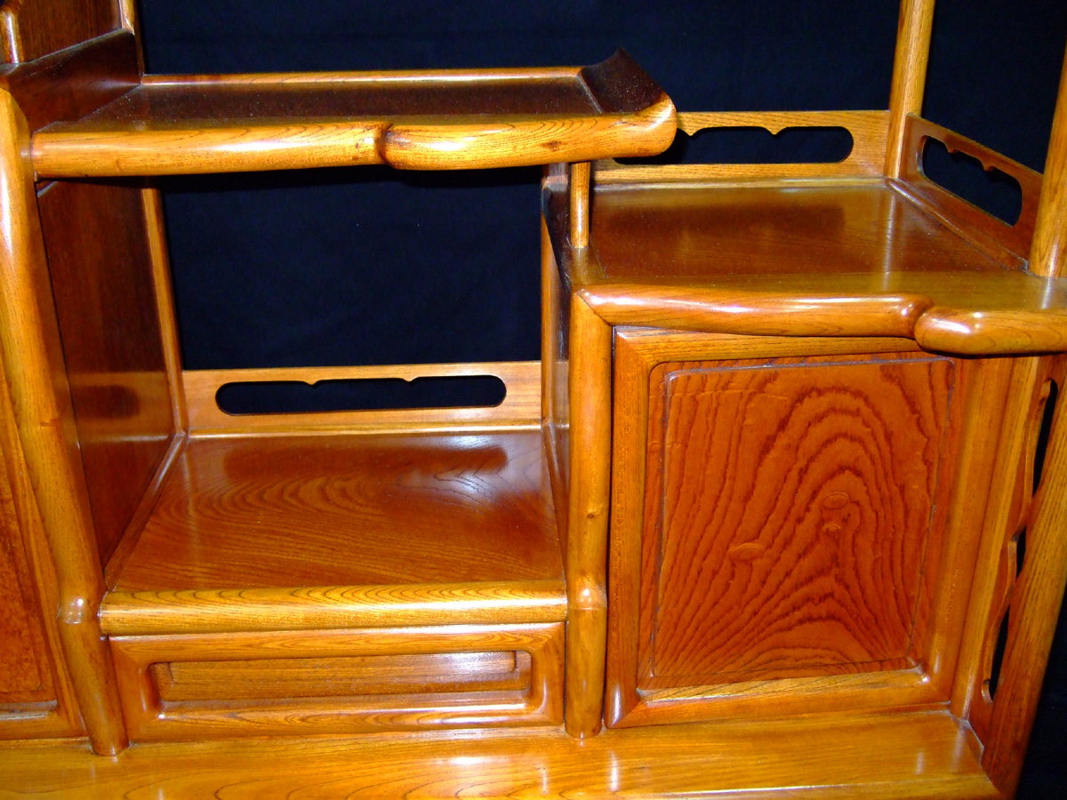 自社で製材した欅の中から、厳選された玉杢の入った材料のみを使用した飾り棚です。表面は漆仕上げで、時間がたつにつれて独特な風合がでてきます。飾り棚(KD-1)より少し小さいサイズになります。